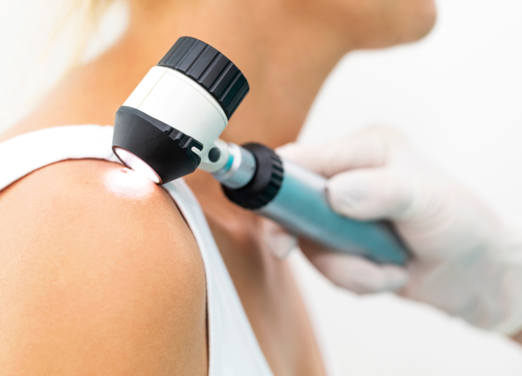 - Dermatoskop: Mit einem Dermatoskop (Auflichtmikroskop) können Veränderungen in tieferliegenden Hautschichten erkannt werden.
